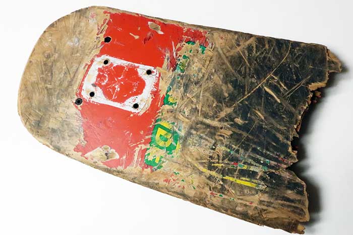 使用済スケートボードに鋲綴じ。状態良好。